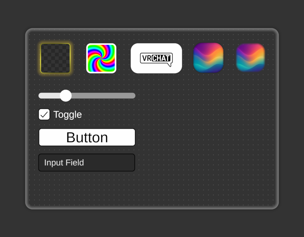 TexCoord1,Normal, andTangentare required on the Canvas component (On by default on VRChat UI) - Shader is only meant for the UI (mesh renderers are not supported)